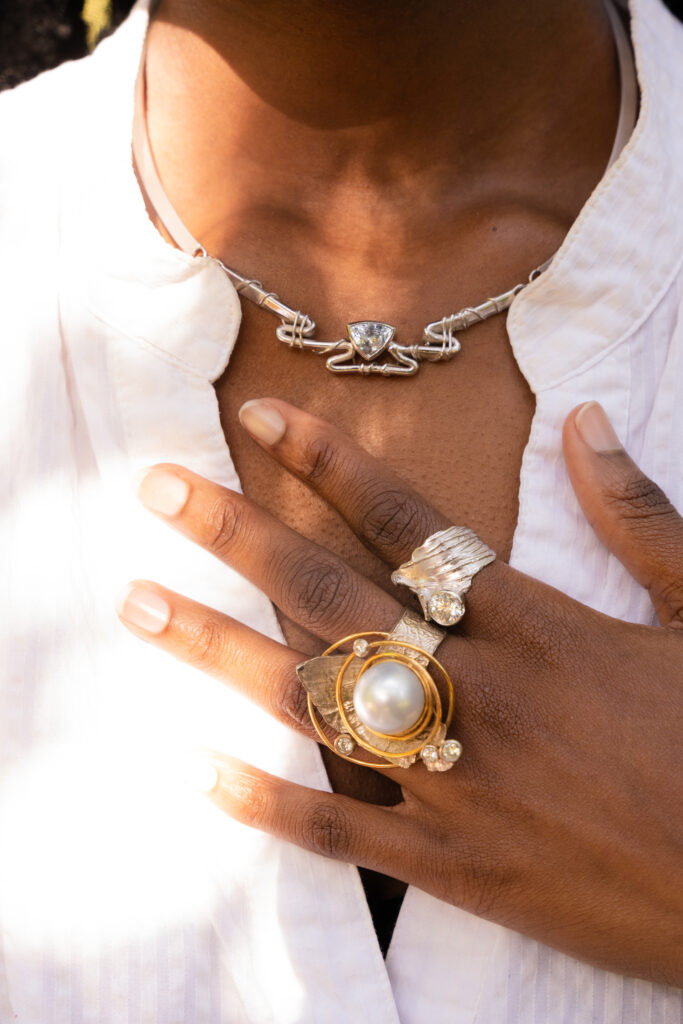 Elk juweel is voor mij een nieuw avontuur, een nieuw verhaal. Net zoals een beeldhouwer met elke slag een nieuwe dynamiek creëert in zijn kunstwerk, speel ik met de structuur van het edelmetaal. Door het juweel rechtstreeks in was te kneden, ontstaat een unieke vorm die nergens anders te vinden is. Het uiteindelijke karakter van het sieraad komt tot leven in de samenvoeging van de verschillende onderdelen. Voor mij staan speelsheid en dynamiek centraal in het afgewerkte juweel.